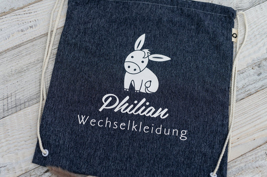 Personalisierter zuckersüßer Stoff Rucksack Tasche Esel Jeans weiß Kinder Kindergarten KiTa mit Kordelzug