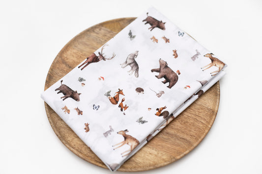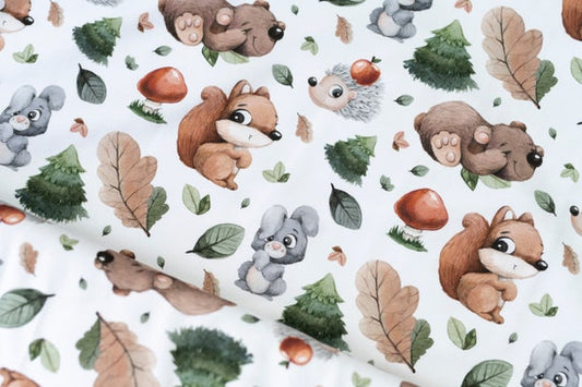 BAUMWOLLE Waldtiere Hase Igel Bär weiß