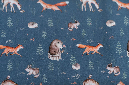 French Terry BIO (GOTS) Waldtiere Stoff - dunkelblau - Fuchs - Bär - Reh