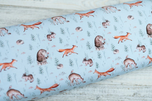 French Terry BIO (GOTS) Waldtiere Stoff - hellblau - Fuchs - Bär - Reh