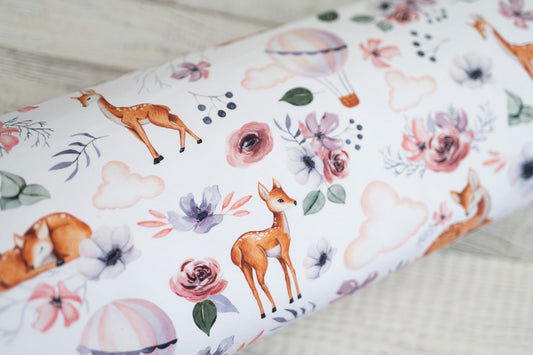 FRENCH TERRY Rehkitz Stoff - Aquarell - weiß - rosa - Boho - Blume