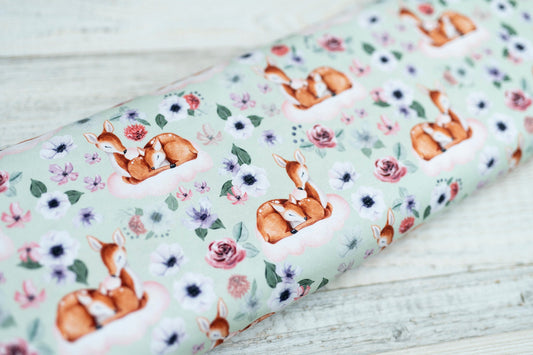 Jersey Rehkitz BIO (GOTS) Stoff - Aquarell - mint - rosa - Boho - Blume